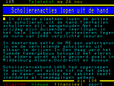 Dit gaat helemaal niet om 1040 uur les. Dit gaat gewoon om lekker rellen, zooi trappen, de achterlijke idioot uithangen. De meeste scholieren weten godbetert niet eens waaróm ze de politie uitdagen, de school vernielen en oude mensen van de sokken rennen. En dat terwijl het kabinet al heeft toegezegd iets te zullen doen aan de vele lesuren. Vele lesuren? Pardon!?